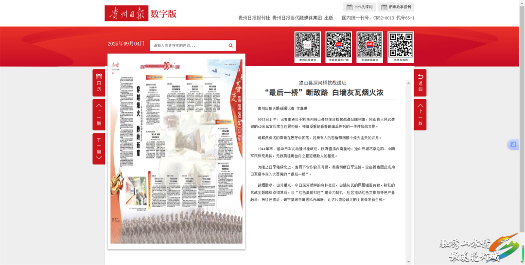 贵州日报:9月4日,贵州日报刊发《独山县深河桥抗战遗址 “最后一桥”断敌路 白墙灰瓦烟火浓》,报道了在1944年末,为阻止日军继续北上,独山县深河桥被炸毁,这座桥也因此成为日军侵华深入大西南的“最后一桥”。今日深河桥畔的麻抹社区,以“红色美丽村庄”建设为契机,社区推动红色文旅与特色产业融合,将红色遗址、研学基地与田园风光串联,让这片饱经战火的土地焕发新生机。