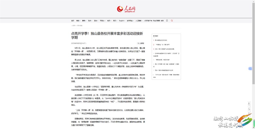 人民网:9月5日,人民网刊发《点亮开学季!独山县各校开展丰富多彩活动迎接新学期》,报道了独山县各中小学、幼儿园正式开启秋季新学期,各校紧扣育人核心目标,精心策划“开学第一课”,将思想引领、习惯培养与成长启蒙巧妙融入各类活动,为学生们打造了一堂堂兼具温度与深度的开篇课。