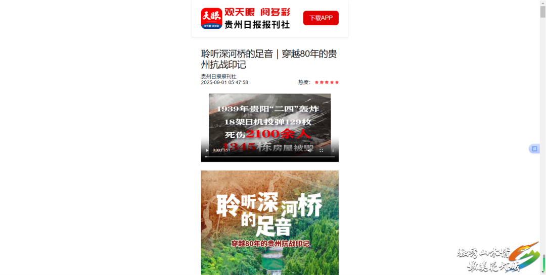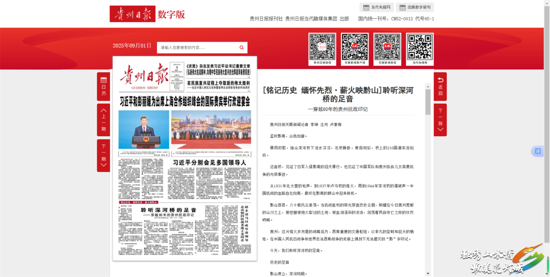 贵州日报、天眼新闻:9月4日,贵州日报头版头条及多平台先后刊发《聆听深河桥的足音—穿越80年的贵州抗战印记》,报道了独山深河桥,见证了日军入侵黔南的滔天罪行,也见证了中国军队和贵州各族儿女英勇抗争的光荣事迹。