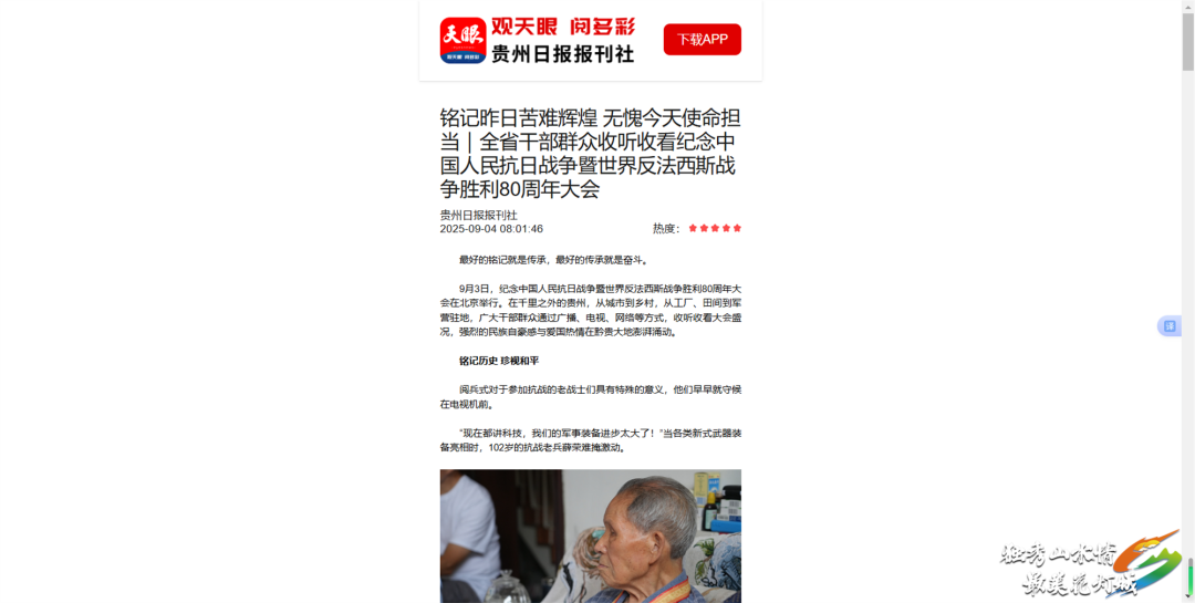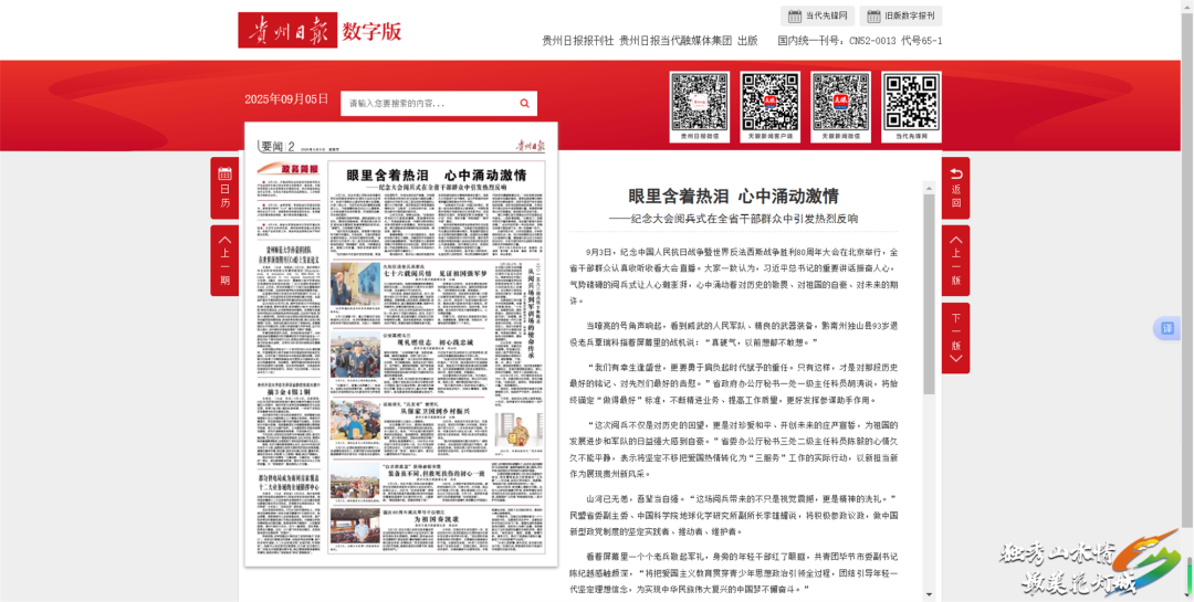 贵州日报:9月5日,多平台先后刊发《眼里含着热泪 心中涌动激情——纪念大会阅兵式在全省干部群众中引发热烈反响》,报道了纪念大会阅兵式在贵州省干部群众中引发热烈反响,其中,独山县93岁退役老兵覃瑞科感想被采用。
