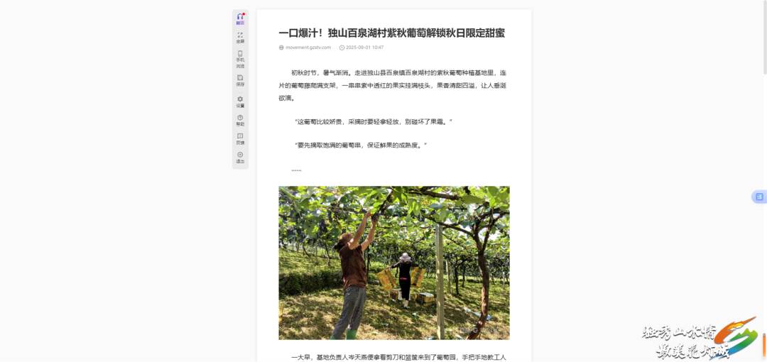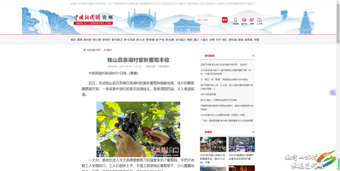 中国新闻网、动静贵州:9月1日,多平台先后刊发《独山百泉湖村紫秋葡萄丰收》,报道了近年来,独山百泉湖村依托城郊经济带优势,以“乡村旅游+精品水果种植+油桐种植”为主导,发展紫秋葡萄等精品水果产业,现已发展特色农家乐10家、精品水果产业6500余亩、新增油桐种植1400亩。