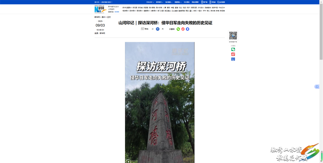 新华网、新华网客户端:9月3日,多平台先后刊发《山河印记|探访深河桥:侵华日军走向失败的历史见证》,报道了在卢沟桥爆发的“七七事变”拉开了中华民族全面抗战的序幕,而在距离卢沟桥2000多公里的贵州省黔南州独山县,深河桥则见证了日军走向败亡。