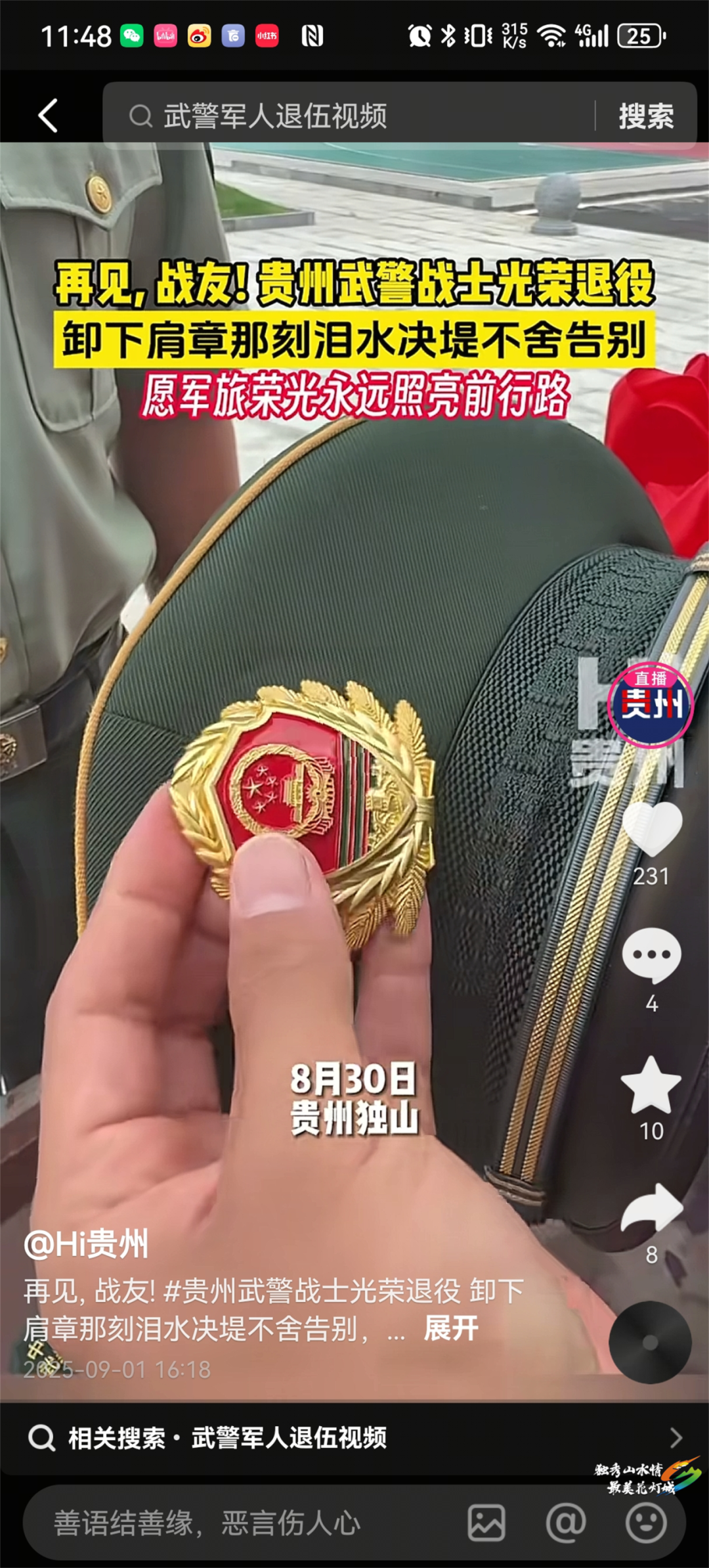 天眼新闻、hi贵州:8月30日,多平台先后刊播《不舍!独山5名武警战士光荣退役,卸衔仪式上大家都红了眼眶》,报道了在独山服役的5名武警战士任期已到,在举行的卸衔仪式上,他们不舍留下泪水。