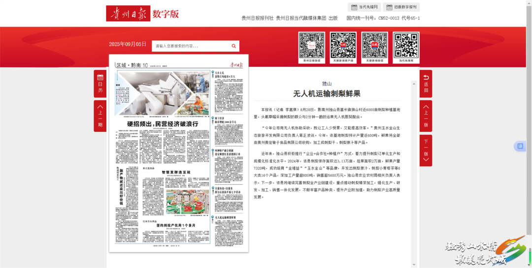 贵州日报:9月5日,贵州日报刊发《独山 无人机运输刺梨鲜果》,报道了独山县基长镇狮山村近6000亩刺梨种植基地丰收,预计产量近600吨。今年,该基地通过无人机协助采收,既让工人少受累,又能提高效率。