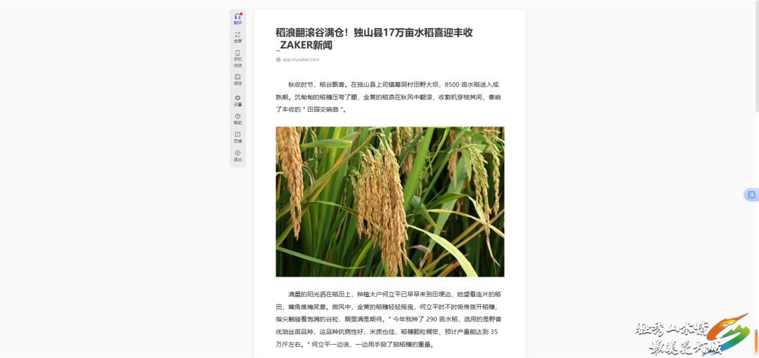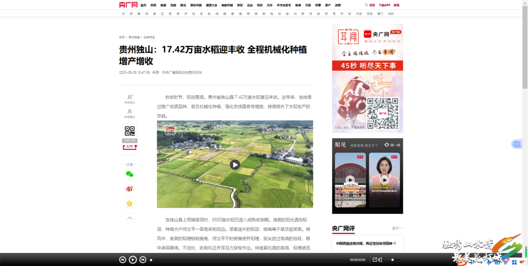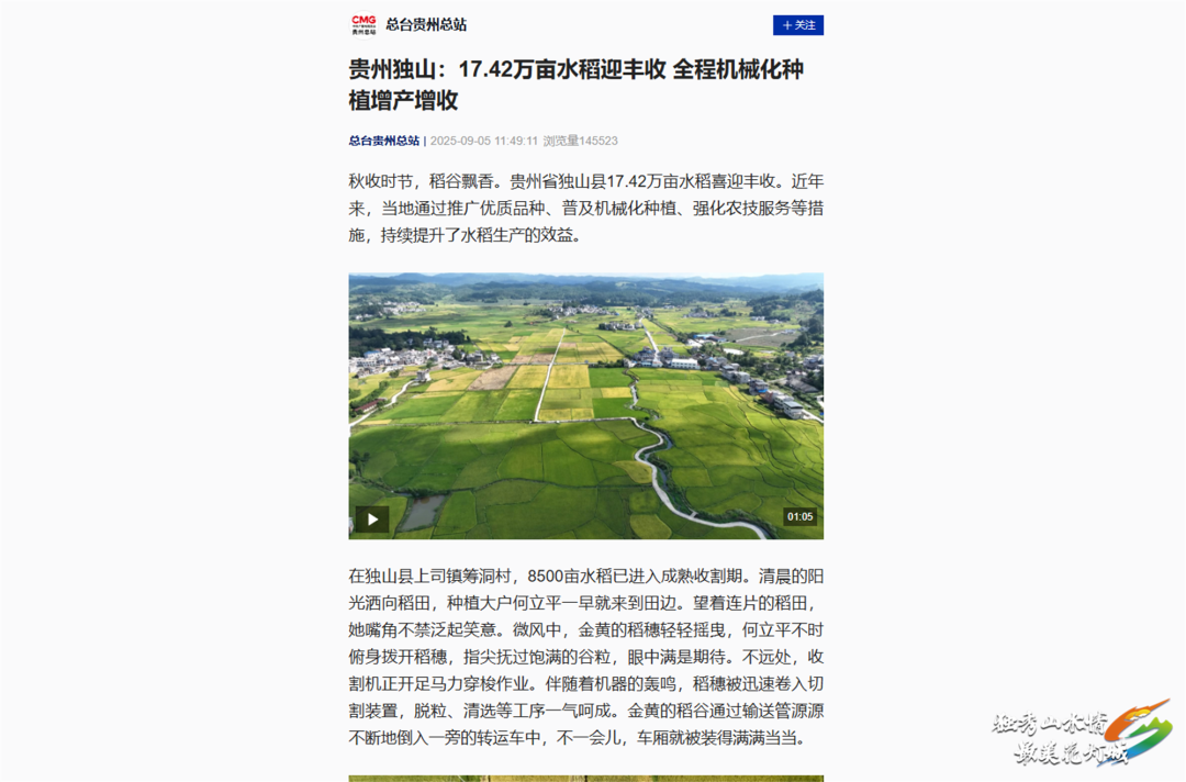 央视新闻客户端、央广网、ZAKER新闻:9月5日,多平台先后刊发《贵州独山:17.42万亩水稻迎丰收 全程机械化种植增产增收》,报道了独山县17.42万亩水稻喜迎丰收。近年来,当地通过推广优质品种、普及机械化种植、强化农技服务等措施,持续提升了水稻生产的效益。