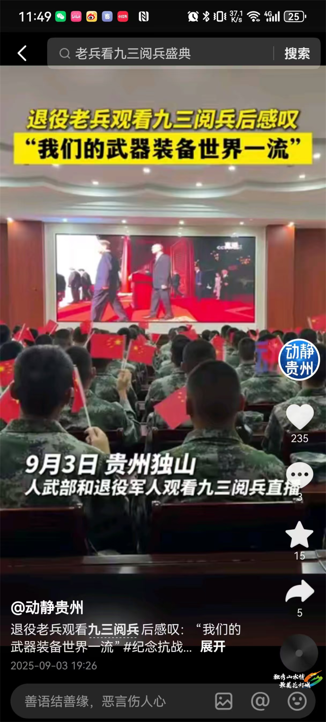 动静贵州:9月3日,动静贵州刊播《退役老兵观看九三阅兵后感叹:我们的武器装备世界一流》,报道了独山退役老兵观看九三阅兵直播后,留下深深的感叹!