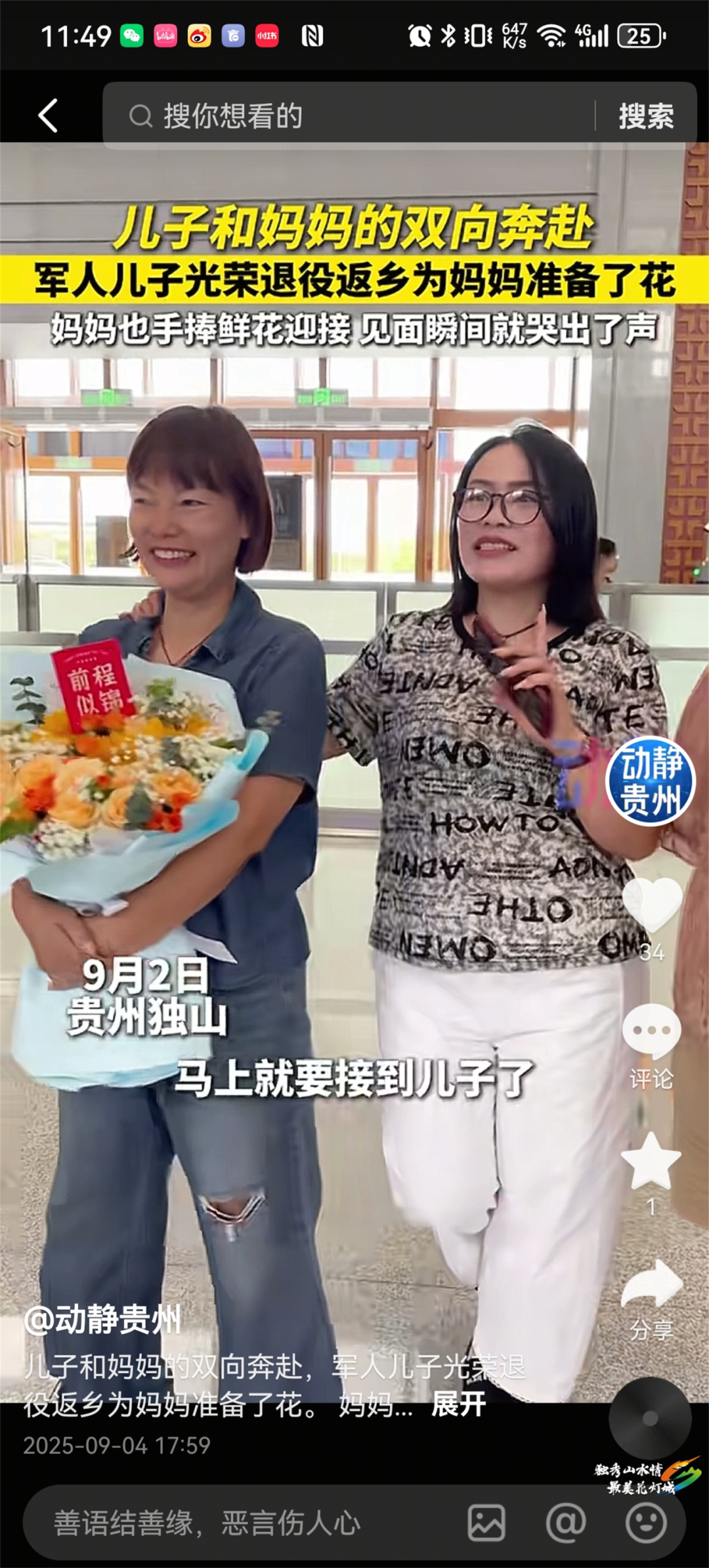 动静贵州:9月4日,动静贵州刊播《儿子和妈妈的双向奔赴,军人儿子光荣退伍返乡为妈妈准备了花,妈妈也手捧鲜花迎接,见面瞬间哭出了声》,报道了在独山高铁站,妈妈与退役的儿子重逢的感人现场。